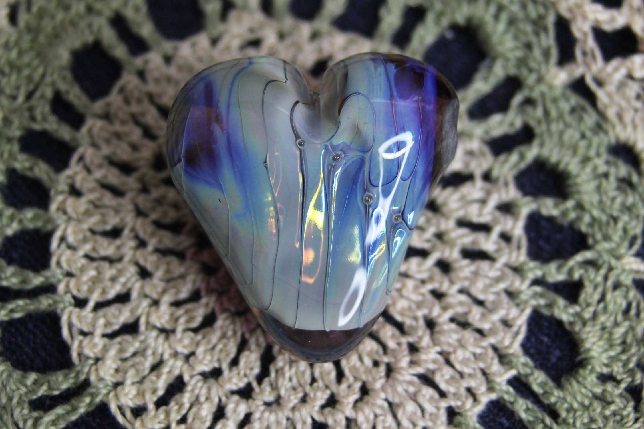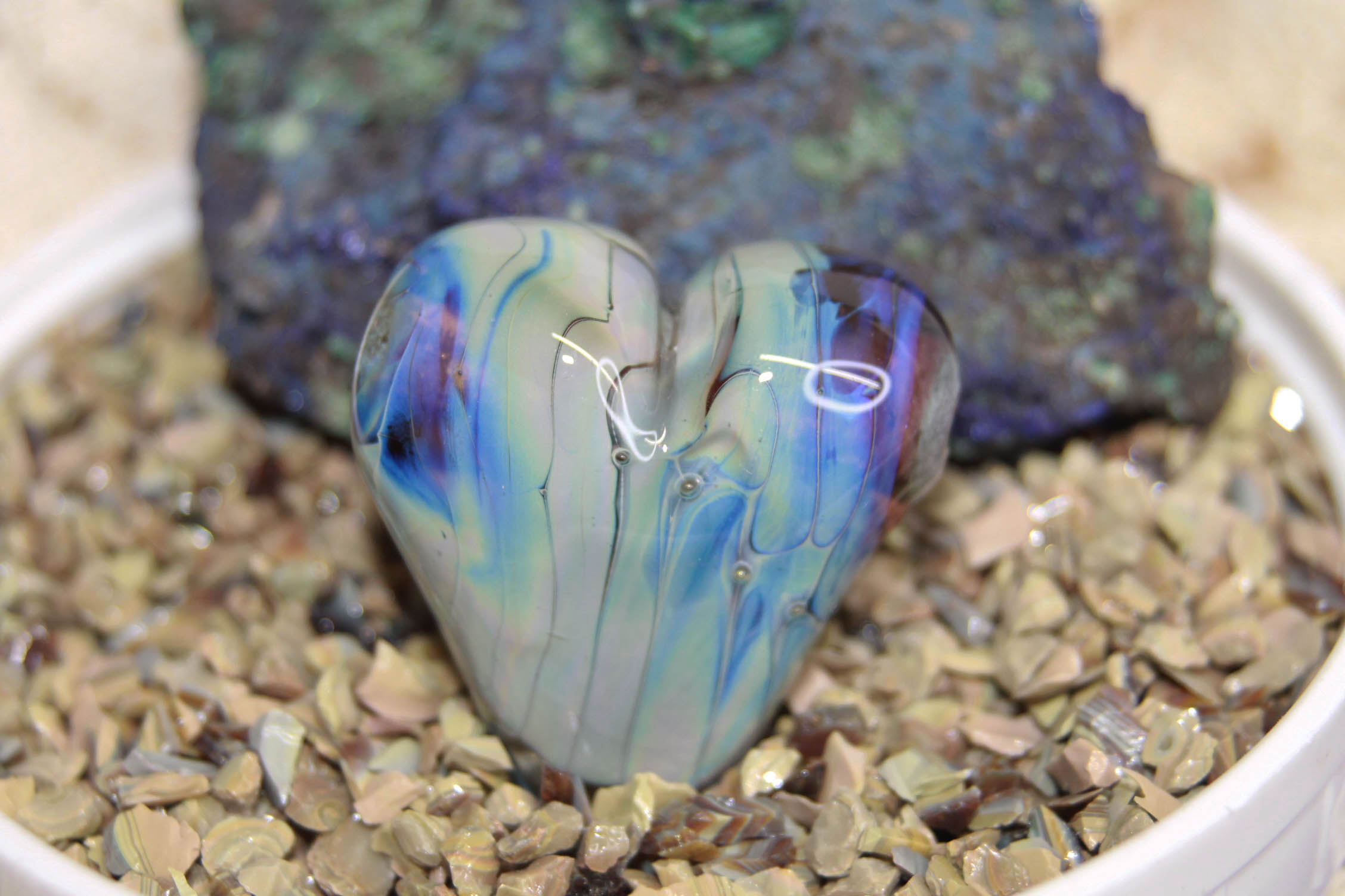 Brilliant blues shift colors in the light in this Double Helix glass. An extra large heart shape allows the color shift to be seen from all angles.